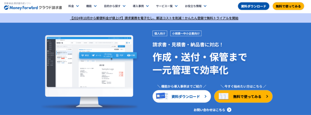 マネーフォワード クラウド請求書は、株式会社マネーフォワードが提供する請求書作成・管理システムです。見積書や納品書、請求書、領収書の作成から送付、ステータス管理までを一元管理で効率化します。