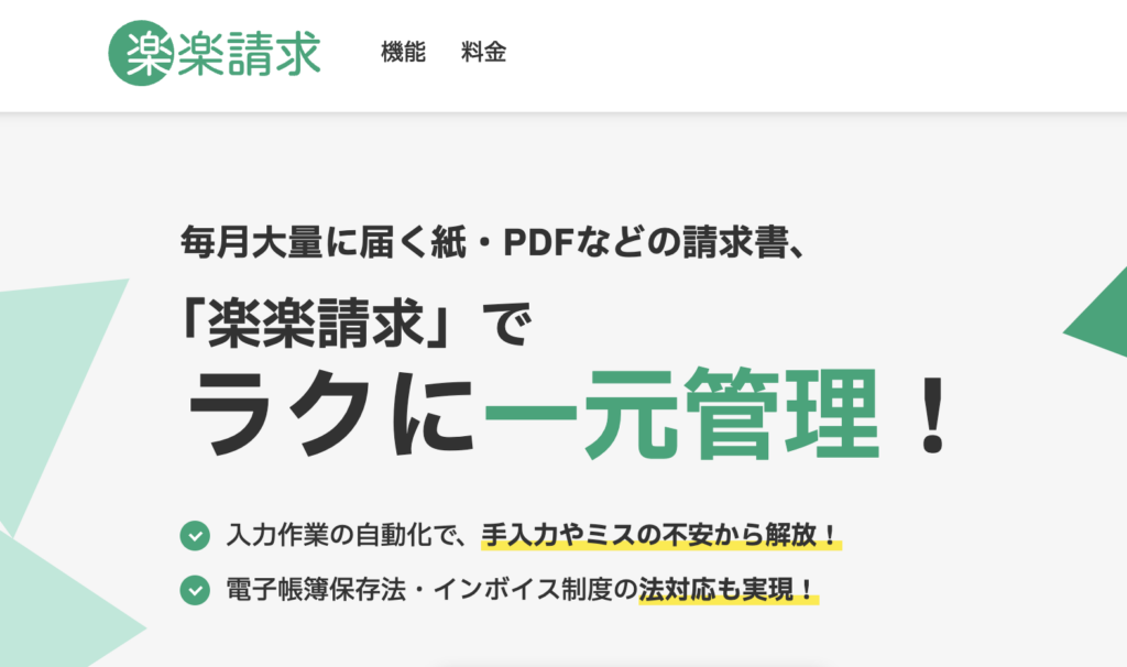 | 主な機能 | シングルサインオン、2要素認証の万全なセキュリティ対策請求書のデータ化(99.9%の精度)支払い申請・承認フローのデジタル化請求書の一覧表示・検索請求書発行機能 |