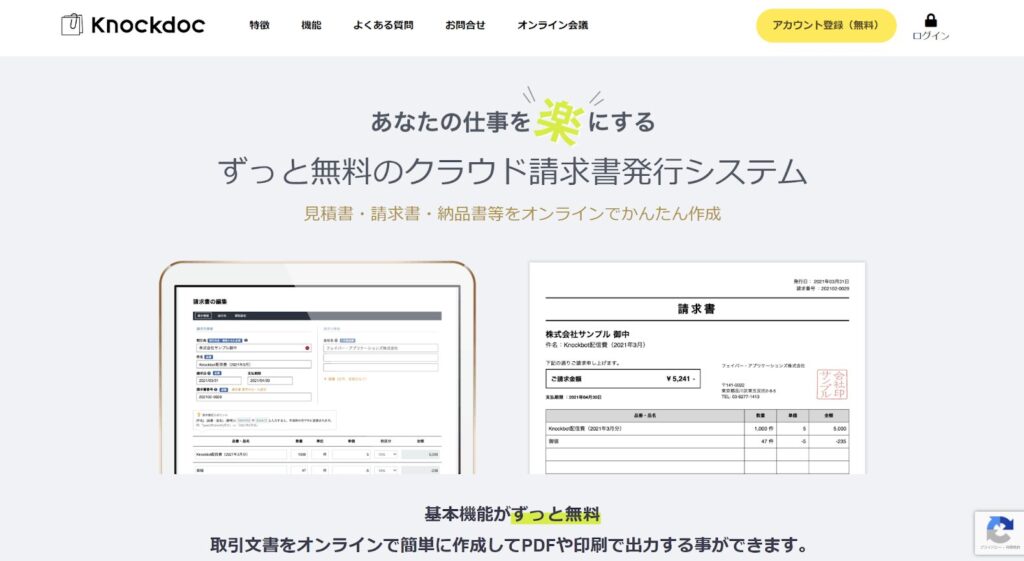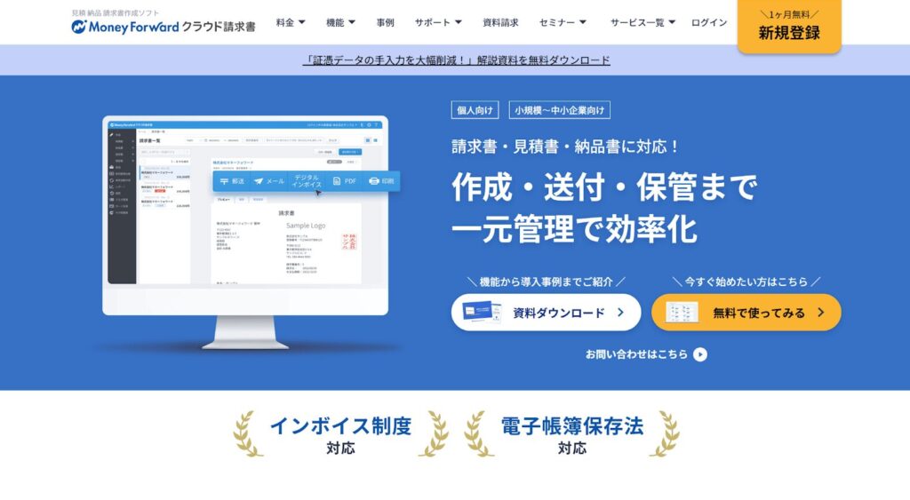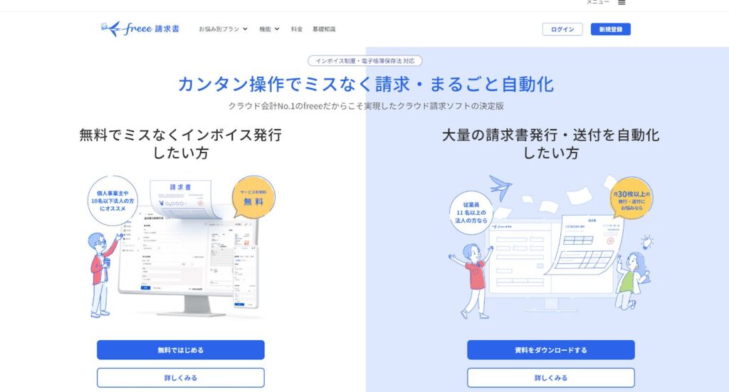 freee請求書は、請求書・見積書・納品書などの帳票をミスなく作成できるツールです。金額や必須項目を入力すれば、自動でインボイス対応の請求書を作成できます。作成後はクラウド上で電子保存できるため、改正電子帳簿保存法に違反することもありません。
