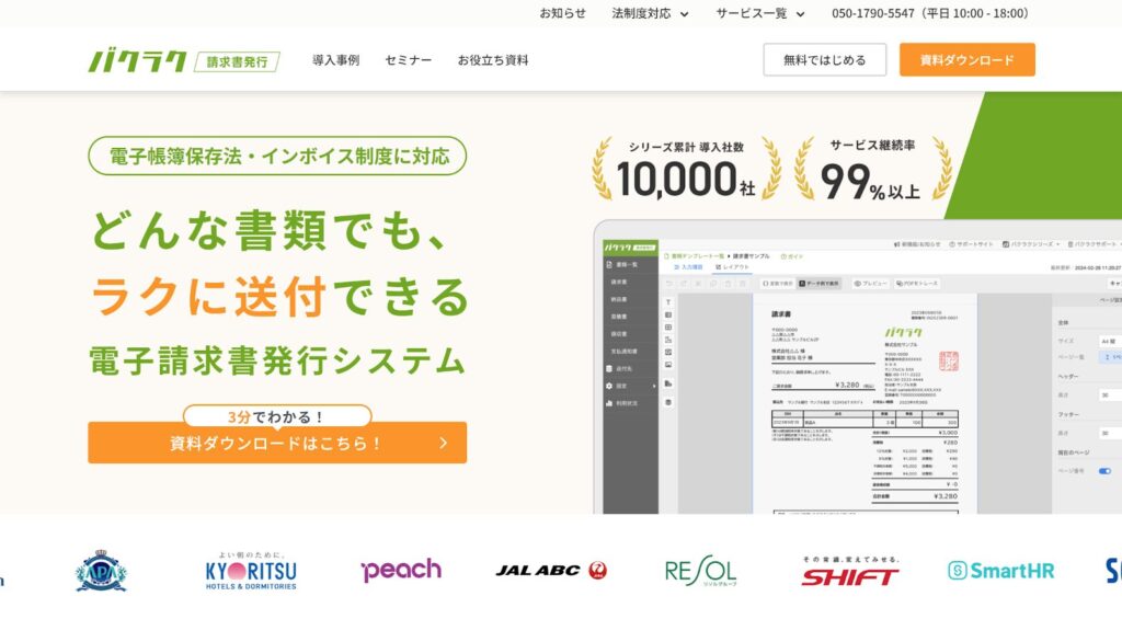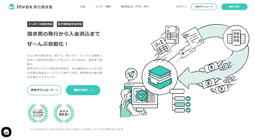 invox発行請求書は2024年2月時点でシリーズ累計20,000社以上の導入実績があり、業界最安水準とも言われるコスパの良さが魅力です。フリープランでは毎月15件まで請求書を発行でき、ユーザー数無制限で利用できます。ただし一部機能制限があるので、請求書発行から入金消込まで自動化したい場合は有料版を検討してください。