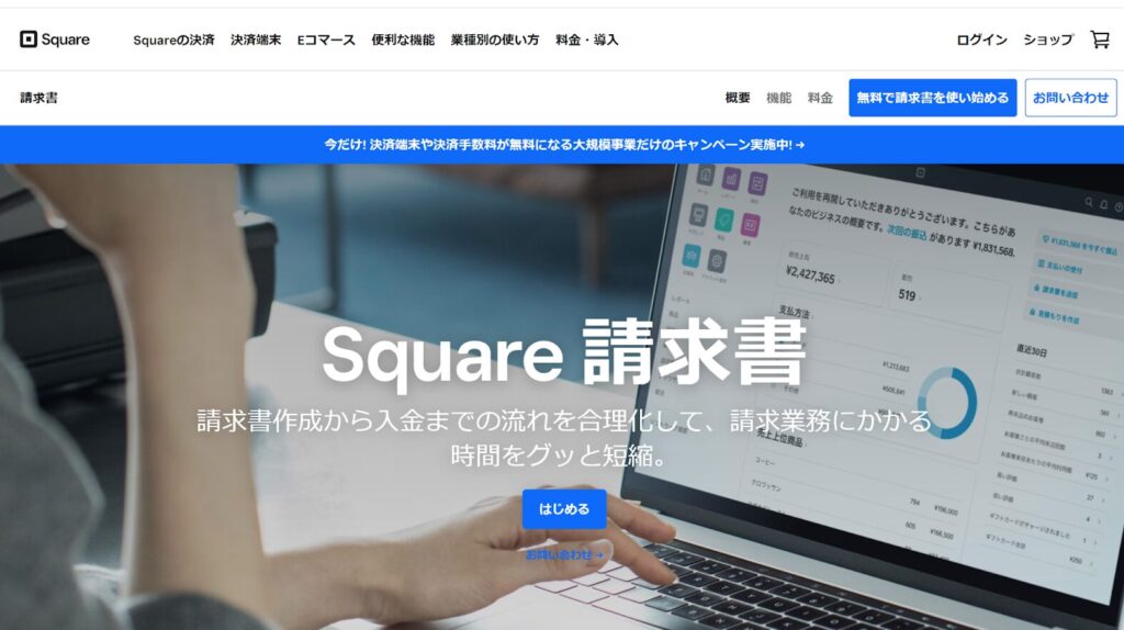 Square請求書は、請求書発行から入金までの業務をまとめて効率化できる請求書作成ツールです。定期的な請求書の自動発行に加え、請求状況を確認できるレポート機能、入金漏れを防ぐリマインダー機能、顧客リスト管理など、請求業務に必要な機能を豊富に搭載しています。