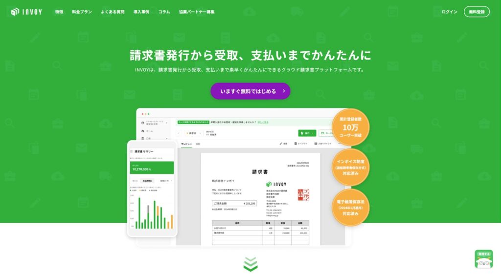 INVOYは、無料で請求書の作成・発行が行えるクラウド請求書プラットフォームです。Freeプランでも請求書の作成・発行や自動データ化、クラウド管理などの基本機能を無制限で利用できます