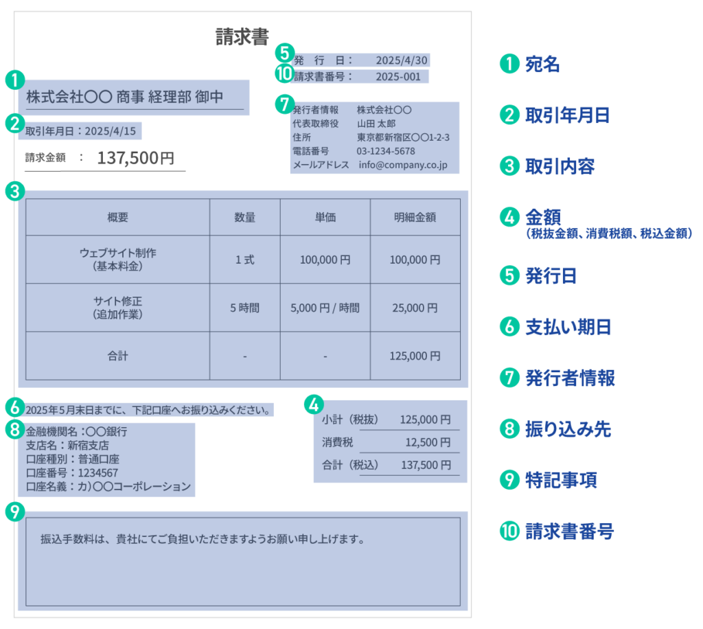 ここでは、請求書作成に必要な項目とその具体的な書き方を、例を交えながらわかりやすく解説します。