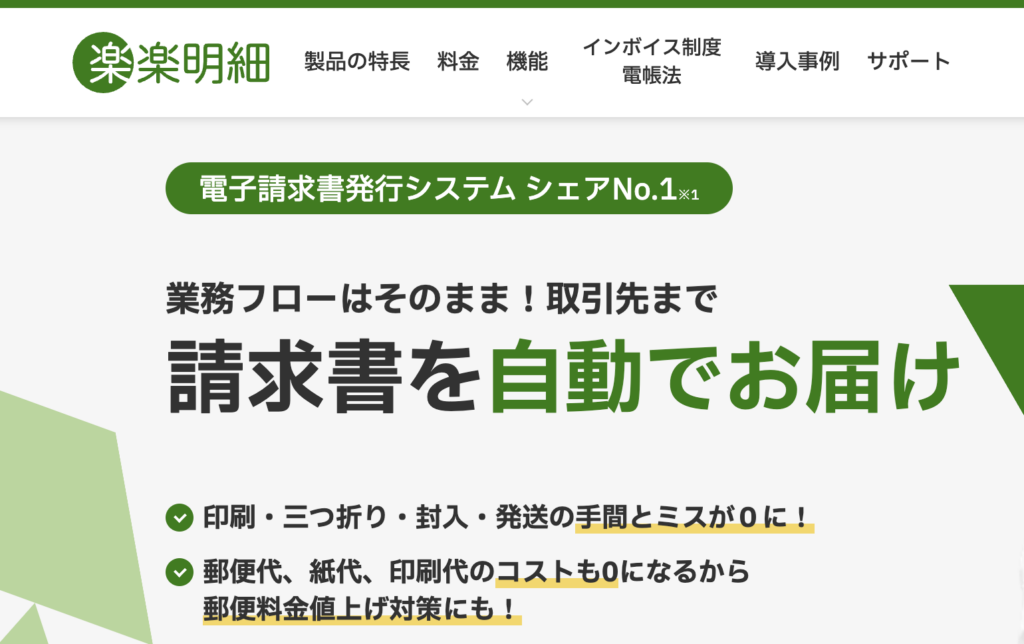 特徴印刷・封入・発送をゼロに郵便代、紙代、印刷代を大幅削減電子帳簿保存法、インボイス制度に対応